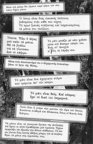 Οι καλλιτέχνες ,μέσα απο τους κώδικες που αντιλαμβάνονται και επεξεργάζονται τον πραγματικό κόσμο,και την ιδιαίτερη αισθητική που διαθέτουν, σταματούν το χρόνο,καταθέτοντας την ψυχή τους ,το προσωπικό τους βλέμμα,εξω απο τα πεπατημένα,υπερβαίνοντας τα αυτονόητα.
