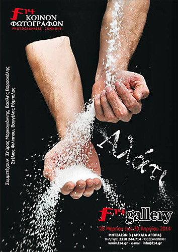 Ομαδική έκθεση Σας περιμένουμε στα εγκαίνια της έκθεσης φωτογραφίας “Αλάτι” όπου συμετέχουν ο Βασίλης Βαρσακέλης, Στέλιος Φιλίππου, Σπύρος Μαρκογιάννης και Βαγγέλης Ρόμπολας την Παρασκευή 28 Μαρτίου 2014 στις 20:30 στην f14 gallery. Πανάρχαιο υλικό που άρχισε να δημιουργείται,από τότε που σχηματίστηκαν οι θάλασσες στη γη. Πατέρας του, ο ήλιος και μάνα του, η γη, τροφοδοτούν…