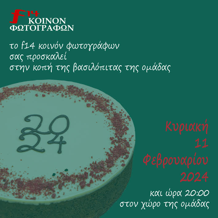 Το f14 κοινόν φωτογράφων σας προσκαλεί στην κοπή της πίτας της ομάδας για το 2024 την Κυριακή 11 Φεβρουαρίου 2024 και ώρα 20:00 στον χώρο της ομάδας.